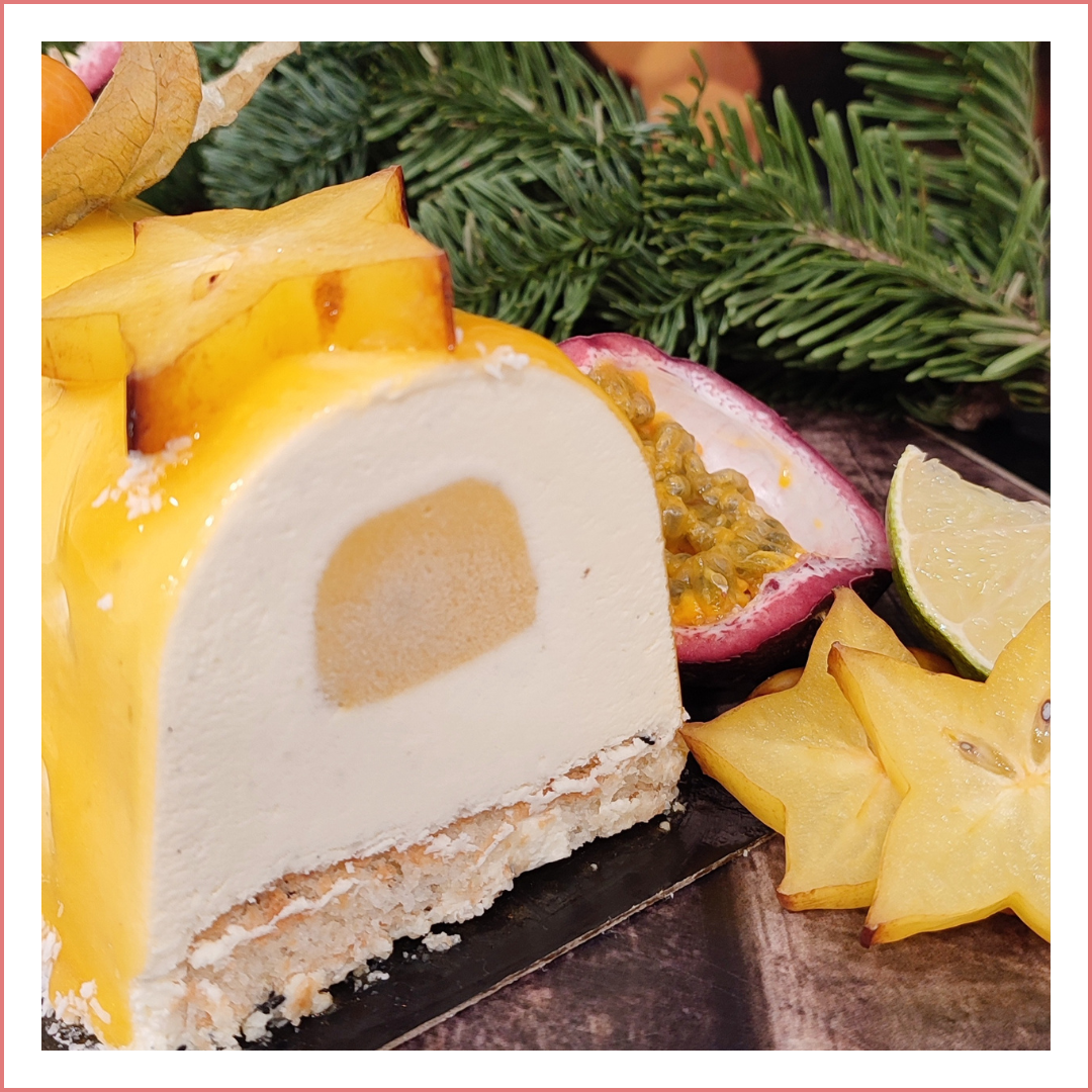 Mousse chocolat blanc aux zestes de citron vert, crémeux mangue, dacquoise coco ( sans gluten)